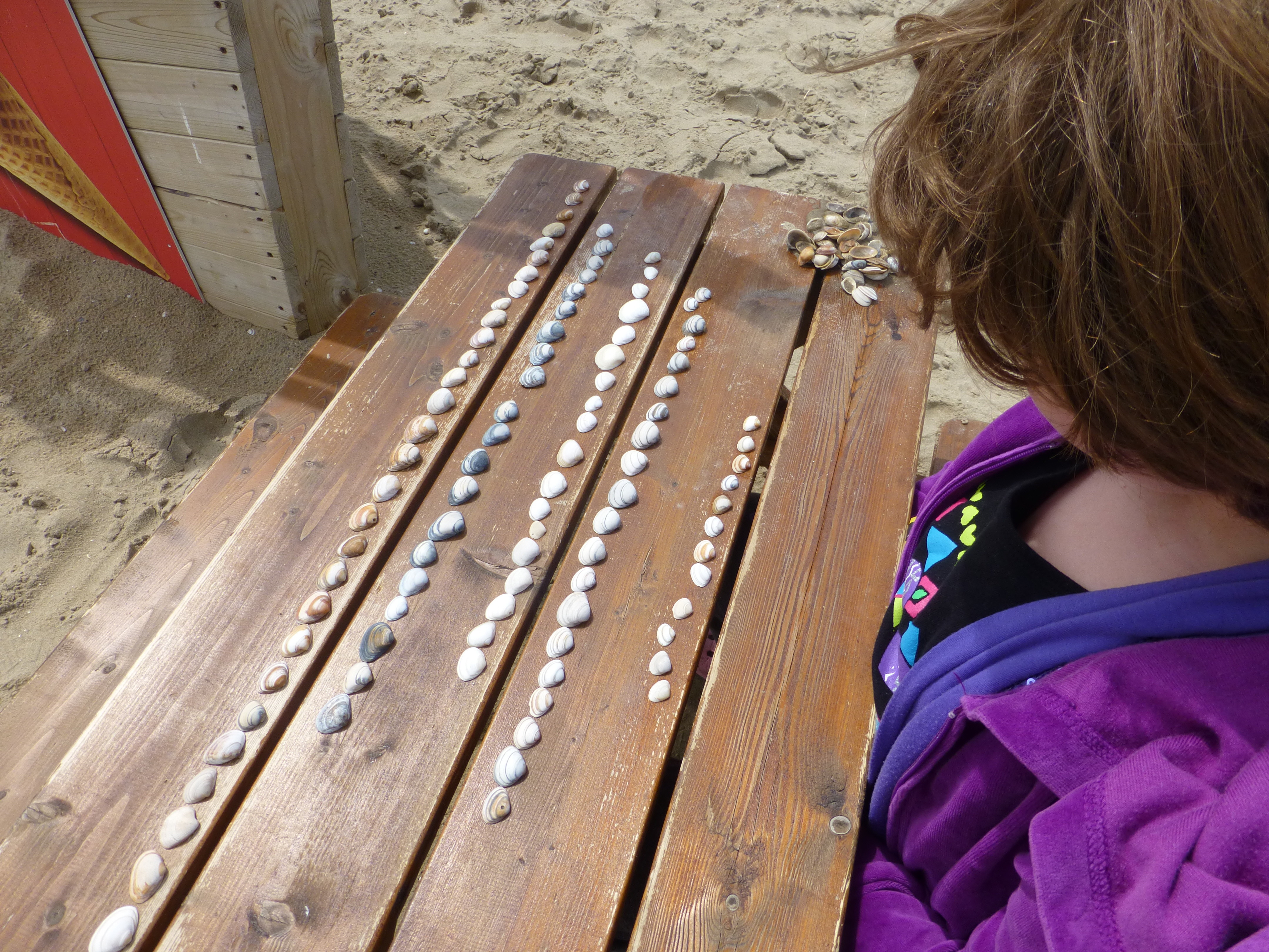 Kathryn sorts sea shells by the sea shore